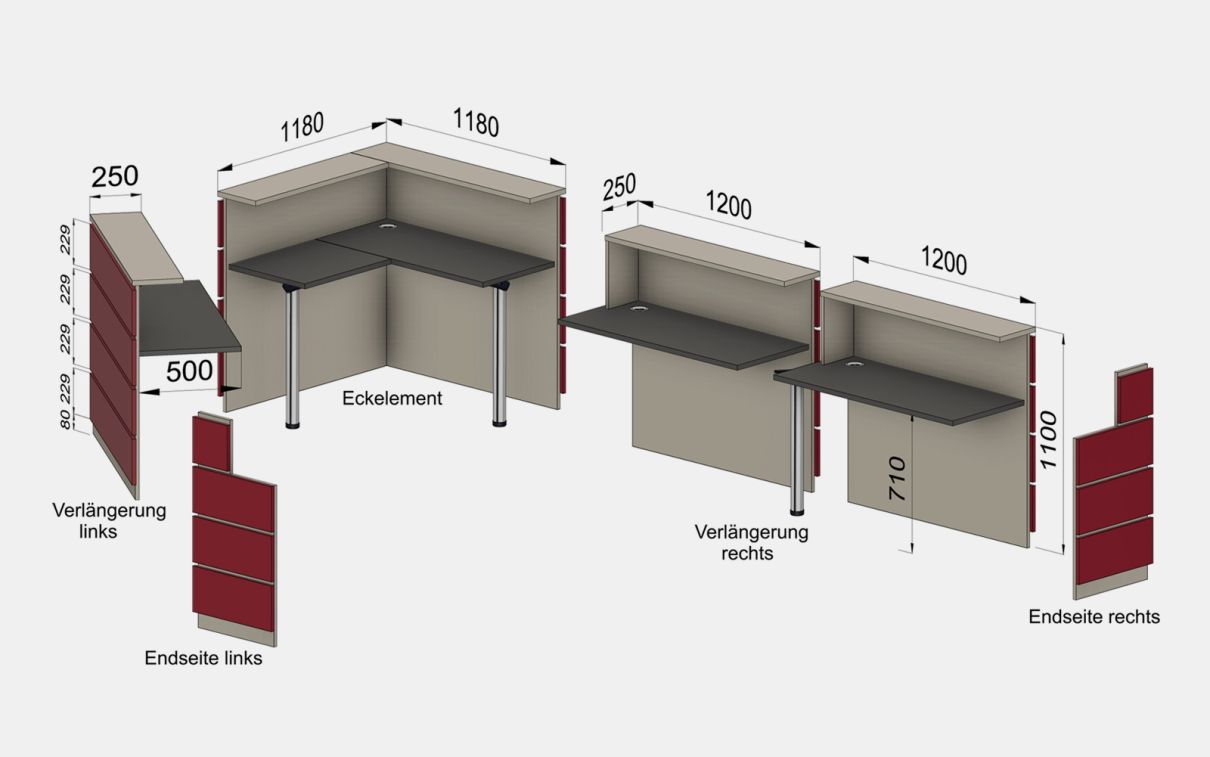 Stellen Sie sich Ihren passgenauen Empfangstresen zusammen. Ihr Modultresen von Schenke wir vorkonfektioniert in Ihrem Wunschdesign auf einer Europalette geliefert. Für den Aufbau benötigen Sie lediglich Kreuzschlitzschraubendreher und Imbusschlüssel.